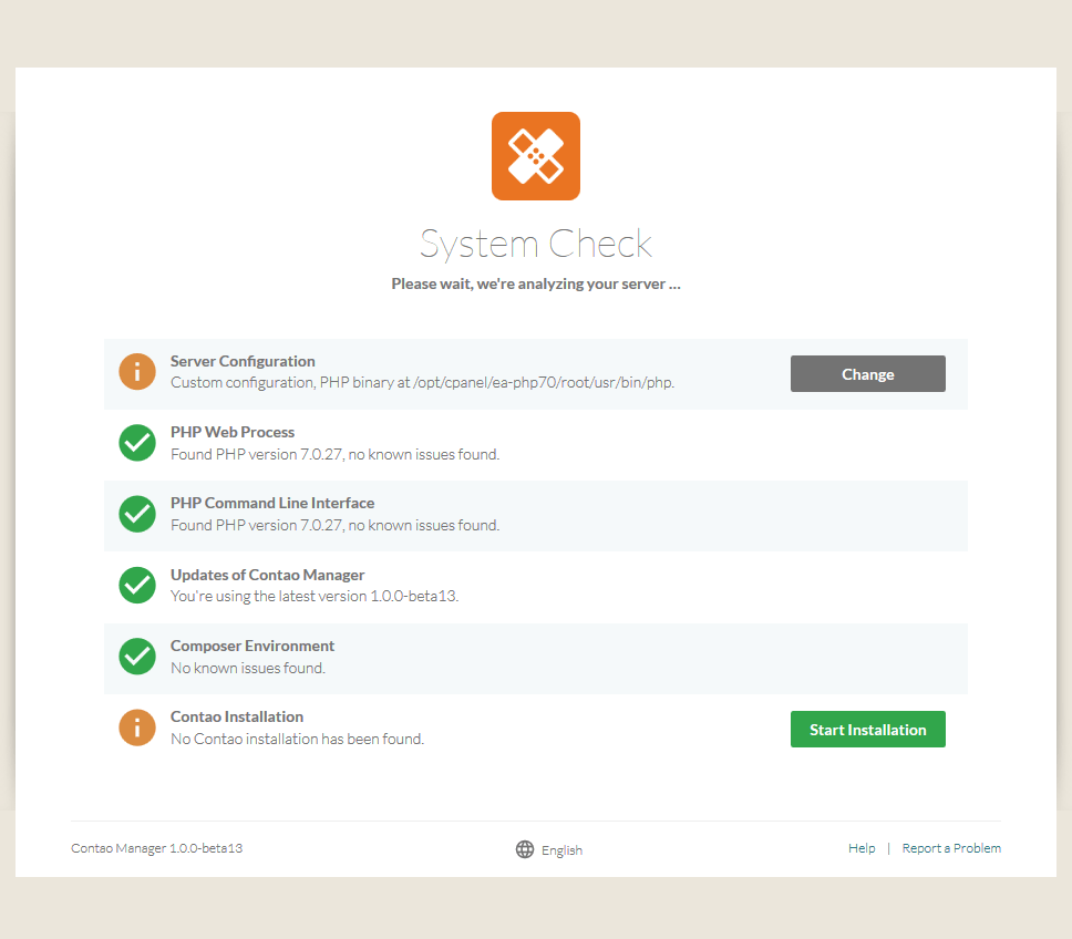 If your hosting provider is configured properly for Contao 4+ the System Check should complete successfully, and you can click 'Start Installation'.