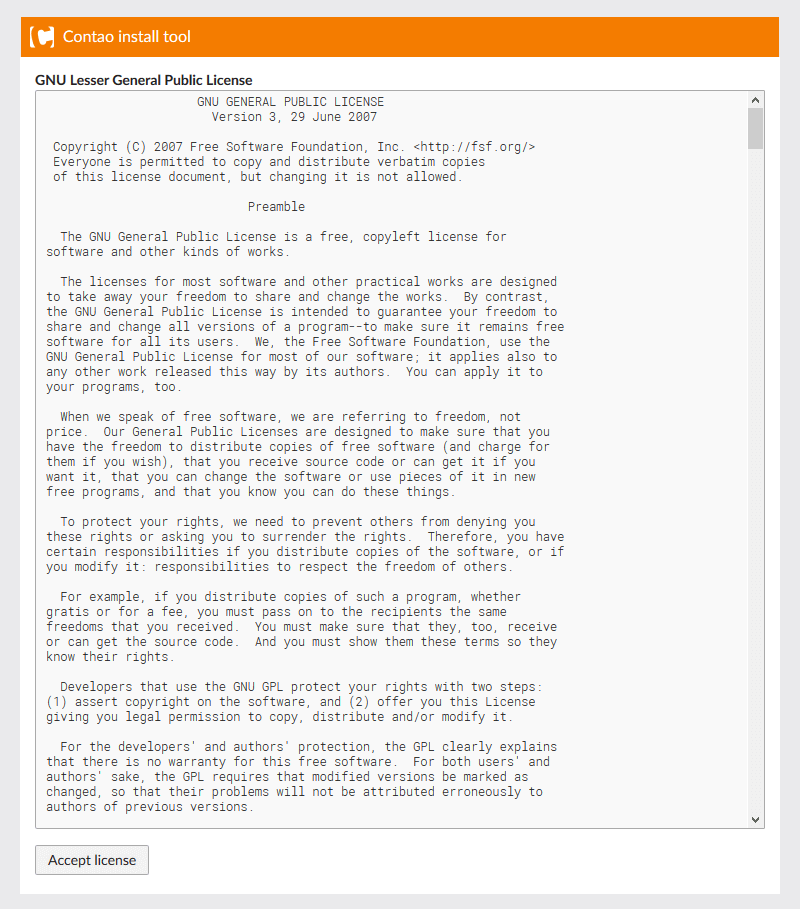 Read and accept the Contao License Agreement.