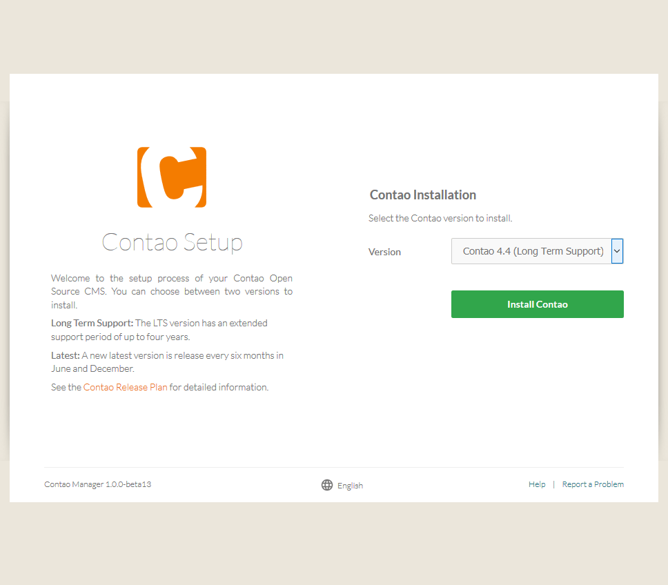 Choose your desired version of Contao and click 'Install Contao'. The newest version has the newest features, but the LTS (Long Term Support) variant promises to be updated for a set period of time so you can be sure that security updates will be available for the foreseeable future.