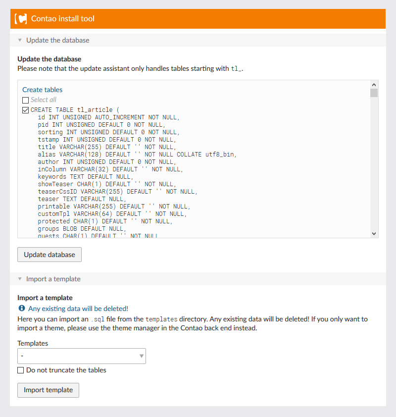 Click 'Update database' to setup the tables in your SQL database.