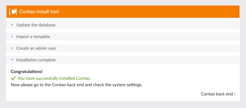 Your Contao installation should now be complete. Click the 'Contao back end' link at the bottom right to continue to login for the first time.