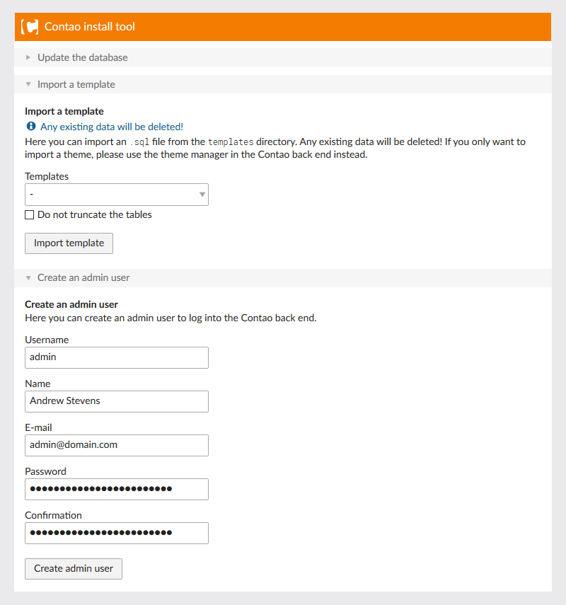 We won't be importing any Templates, so just skip to the 'Create an admin user' section. Enter the user details and click the 'Create admin user' button to create the user and continue.