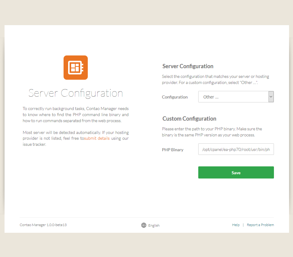 Configure your server by entering the path to your PHP executable, and click 'Save'. It will be automatically filled in if found by Contao Manager.
