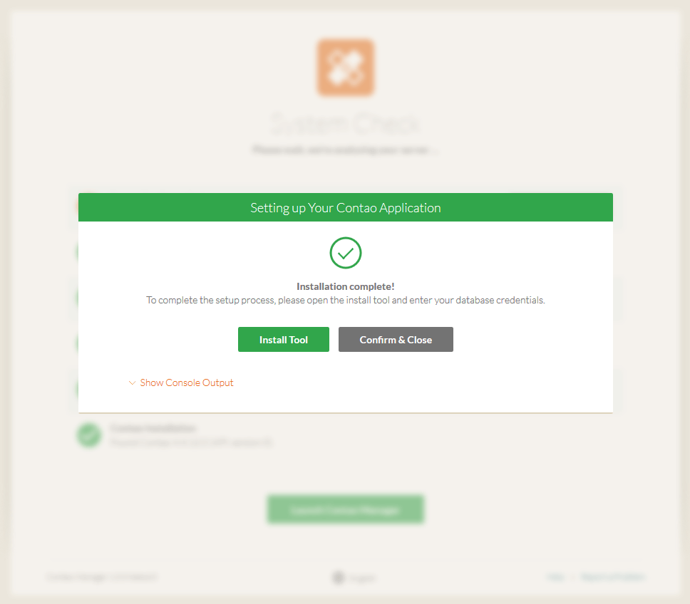 If everything is successful you should be greeted with an Installation Complete message. Click 'Install Tool' to go to the Contao install tool to link your new installation to your SQL database and create your first admin user.