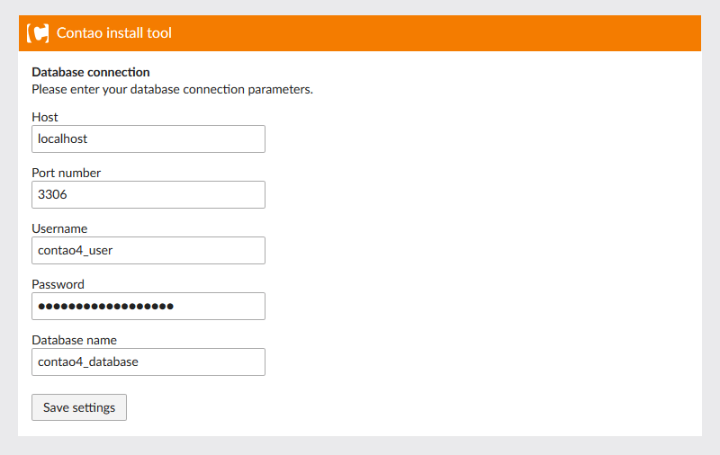 You should have already created an SQL database and user for this Contao installation. Enter your Database credentials here, and click 'Save settings' to link your database to this installation.